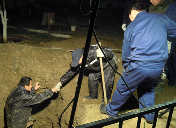 項(xiàng)目部將漏水和檢查情況上報(bào)公司領(lǐng)導(dǎo)后,公司領(lǐng)導(dǎo)果斷決定立即展開(kāi)搶修,總工辦和項(xiàng)目部接到命令立即對(duì)現(xiàn)場(chǎng)漏水處進(jìn)行開(kāi)挖,公司總經(jīng)理黃建偉、副總經(jīng)理程建軍、公司顧問(wèn)王保華高度重視親臨現(xiàn)場(chǎng)指導(dǎo),總工辦技術(shù)總監(jiān)李長(zhǎng)青、住宅總監(jiān)畢建忠也親臨現(xiàn)場(chǎng)指揮,真武家園項(xiàng)目部陳寶松、楊雙玉、王兵、李文利、張慶元、王寶亮、陳勇、郭永忠、郭純良主動(dòng)加班搶修,資料館項(xiàng)目部孟勇、央視住宅項(xiàng)目部呂東聞?dòng)嵰仓鲃?dòng)加入到搶修工作中。