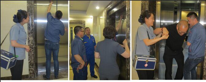 電梯維保單位人員協(xié)同項(xiàng)目電梯安全員將電梯設(shè)置故障,被困轎廂人員(維保部員工扮演)立即按響警鈴,隨著警鈴的響起,演練活動拉開序幕。監(jiān)控運(yùn)行值班員迅速做出反應(yīng),一邊詢問被困人員情況,安撫其不要著急等待救援,一邊通知客服電梯出現(xiàn)故障有人被困,并通報(bào)具體情況??头藛T立即向經(jīng)理助理及設(shè)備維保部主管進(jìn)行匯報(bào),同時(shí)另一名客服人員攜帶應(yīng)急醫(yī)藥箱趕赴現(xiàn)場對被困人員進(jìn)行安撫。