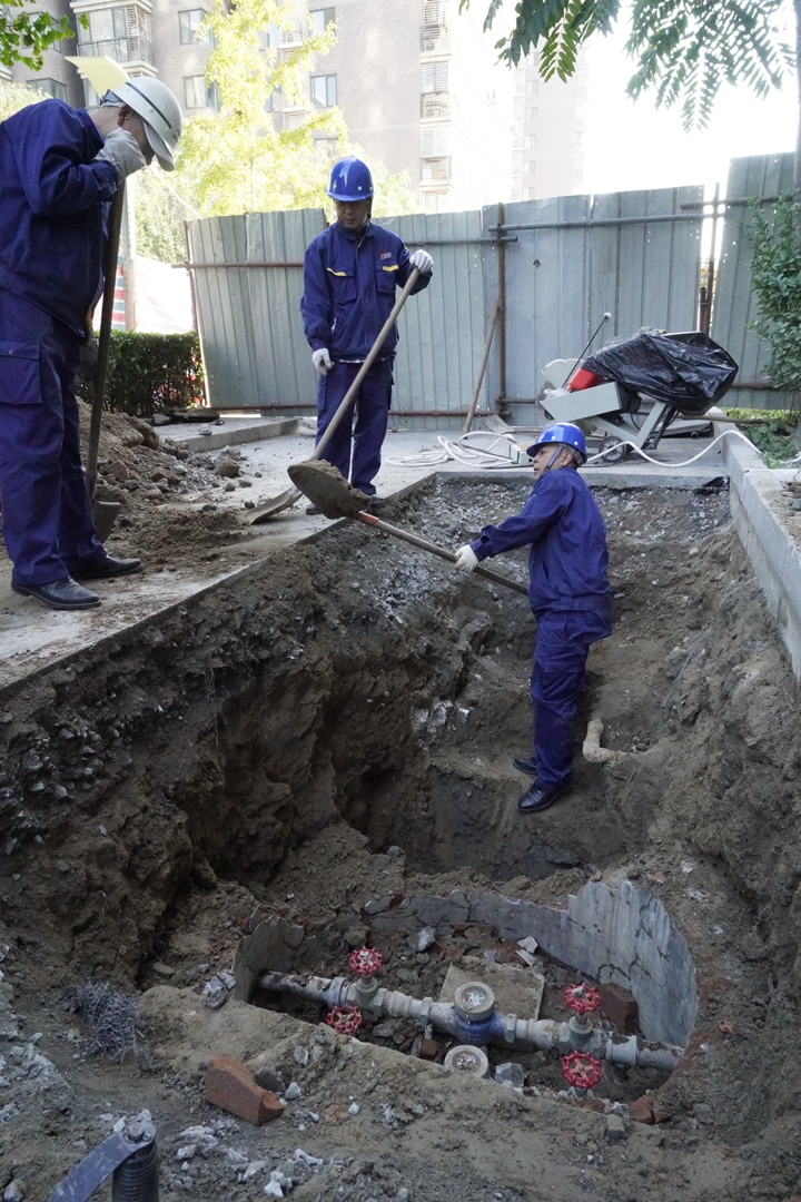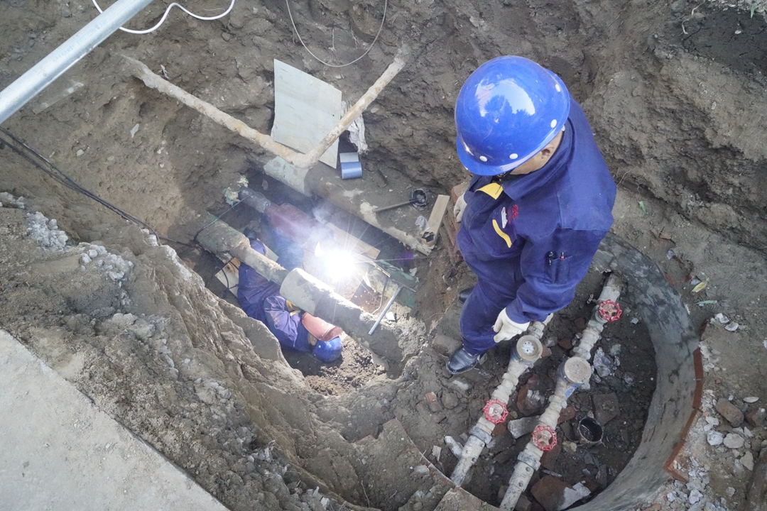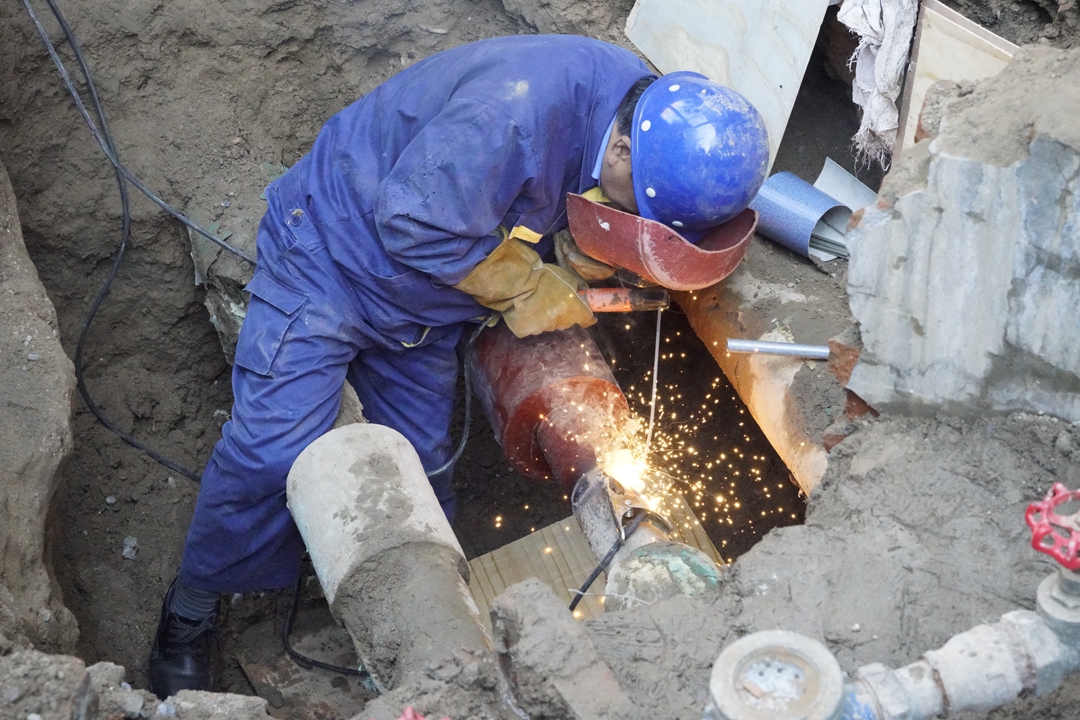 10月28日上午9時切割地面開始挖土。多名員工輪流上陣連續(xù)作業(yè),挖坑長5米多,寬2米,深3米土坑,挖土近30立方米。在29日下午15時左右找到漏水點(diǎn)準(zhǔn)備焊接工作。電焊工薛江、呂家斌在狹小的空間內(nèi)開始焊接,連續(xù)四個小時的細(xì)致焊接,兩人克服種種困難完成任務(wù)。之后開啟供暖補(bǔ)水泵補(bǔ)水,確認(rèn)焊接口不漏水。
