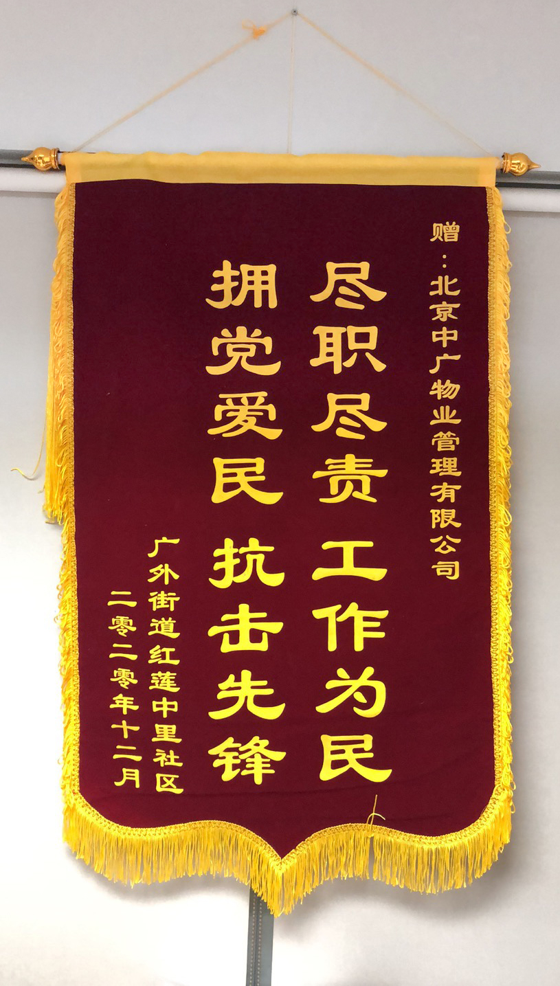 這面錦旗飽含著項目一線員工在疫情防控工作中盡職堅守,垃圾分類工作中吃苦耐勞的認(rèn)可與感謝,是對公司配合社區(qū)疫情防控工作,垃圾分類精細(xì)化管理的贊揚與肯定。中廣物業(yè)公司全員將繼續(xù)發(fā)揚釘釘子精神,一張藍圖繪到底,不辜負(fù)上級單位和社區(qū)居民對我們的每一份信任。