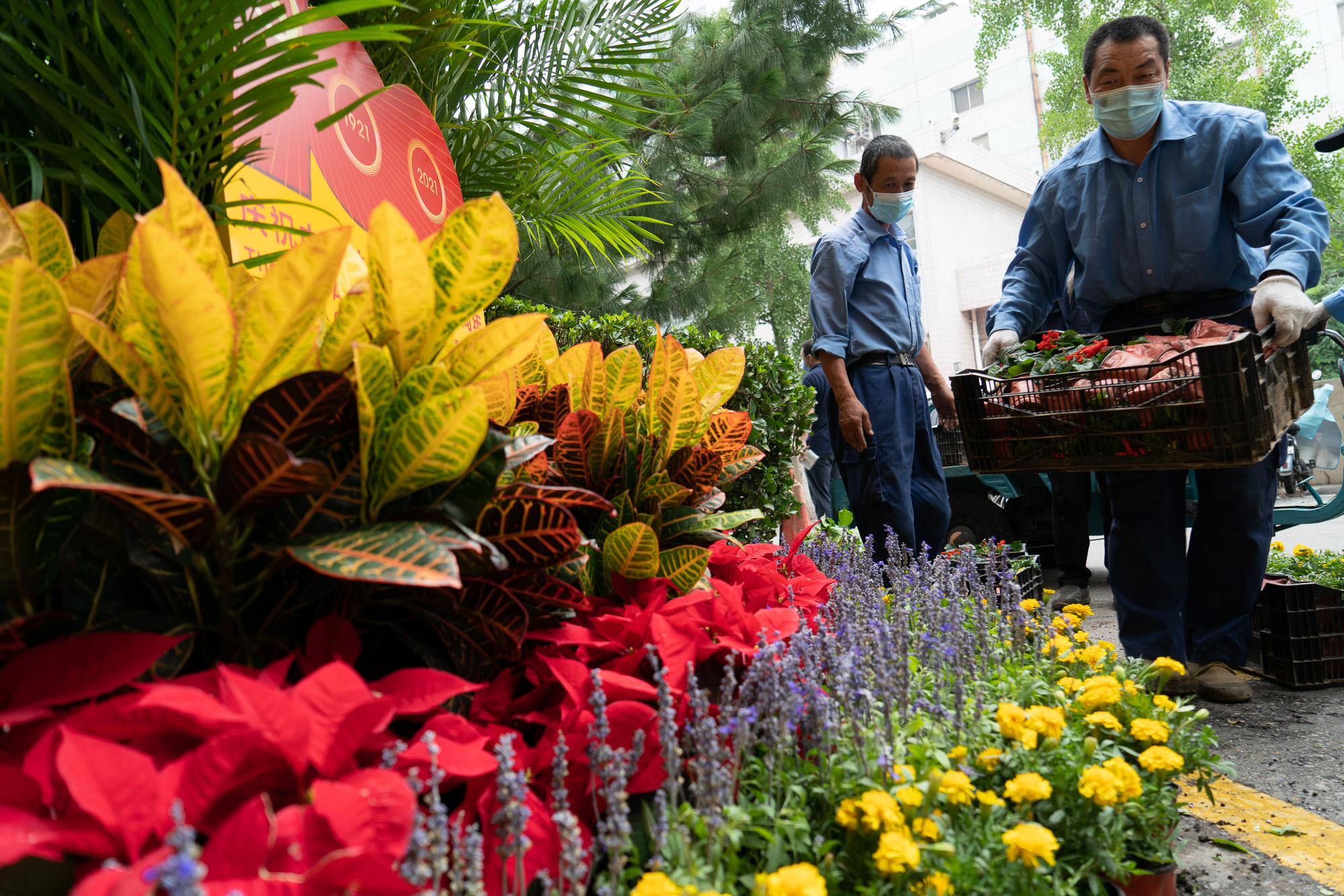 為了按時完成花壇擺放工作,園林綠化子公司員工主動放棄休息,連日綿綿的陰雨,擋不住勞動的熱情,呈現(xiàn)出一派熱火朝天的景象,用辛勤的汗水向中國共產(chǎn)黨成立100周年獻禮。經(jīng)過大家的不懈努力,在不到兩天的時間內(nèi),全部完成總臺復興路辦公區(qū)花壇布置工作,累計布置花卉3000余盆,營造隆重、熱烈的節(jié)日氛圍。