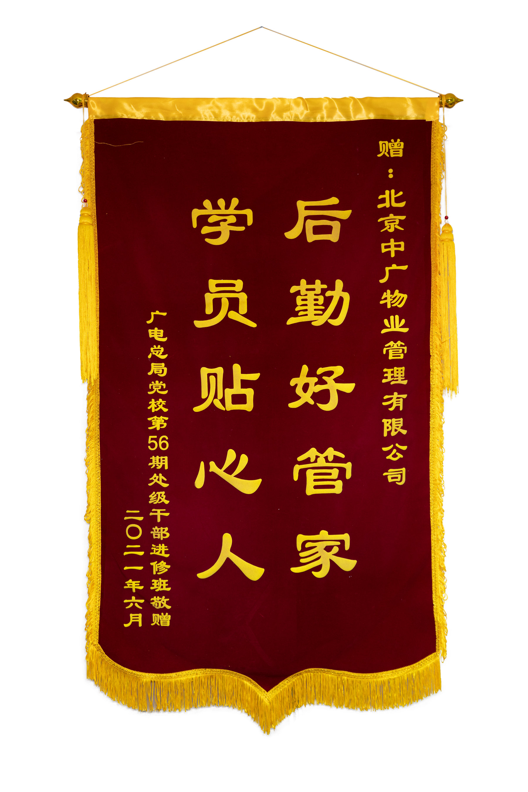 近日,中廣物業(yè)公司總局研修學(xué)院項(xiàng)目部收到國(guó)家廣電總局黨校第56期處級(jí)干部進(jìn)修班全體學(xué)員贈(zèng)予“后勤好管家,學(xué)員貼心人”錦旗。錦旗的背后是全體學(xué)員對(duì)公司物業(yè)服務(wù)高度肯定和誠(chéng)摯感謝,也代表著全體學(xué)員對(duì)項(xiàng)目部服務(wù)人員的信任和支持。