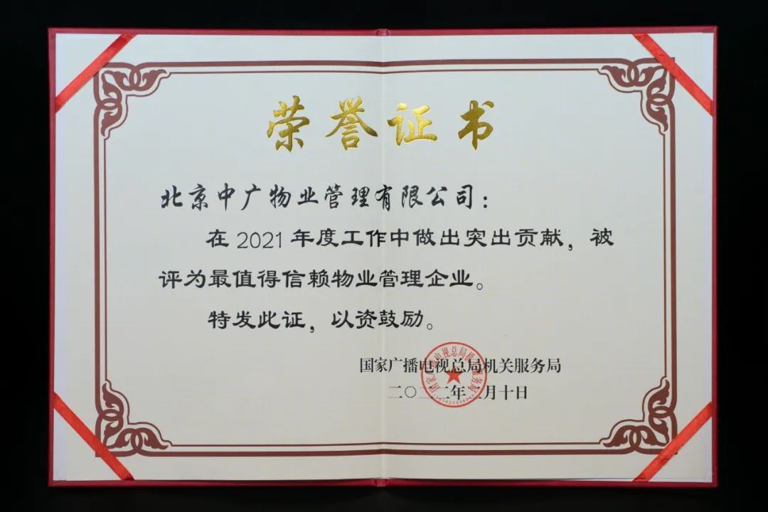 近日,在國家廣播電視總局機關服務局2022年度工作會議上,北京中廣物業(yè)管理有限公司連續(xù)第十二年獲“最值得信賴物業(yè)管理企業(yè)稱號”,公司總經(jīng)理崔立新代表公司上臺領獎。