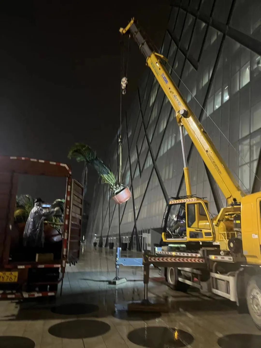 為盡可能將大型盆栽季節(jié)性更換工作對總臺辦公區(qū)域影響降低,同時方便綠植運輸及吊運車輛進出,公司決定利用夜間辦公人員相對較少時段進行作業(yè)。公司領導及相關部門負責人親臨現(xiàn)場督導協(xié)調,從傍晚六點至次日凌晨三點,共計出動員工20余人,大家不顧深夜低溫,冒雨進行吊裝、轉運、種植、加固等操作,最終將光華路辦公區(qū)主樓外圍7棵海藻樹和15棵鐵樹種植完成,并將近4米高的22棵云杉樹重新轉運移栽至總臺指定地點進行養(yǎng)護,為冬季景觀打造奠定堅實基礎。