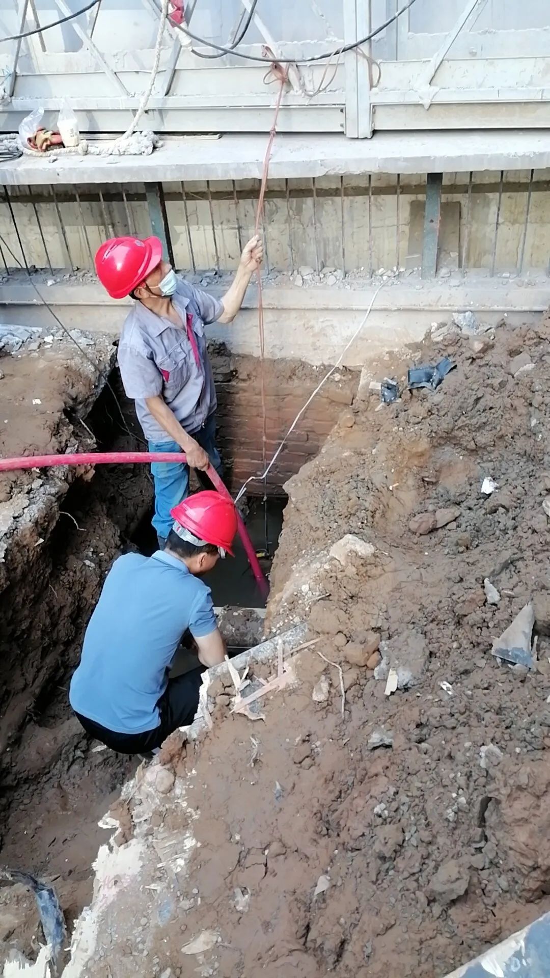 6月28日,北京中廣物業(yè)管理有限公司影視之家項(xiàng)目部值班人員在巡視中發(fā)現(xiàn),南樓西側(cè)室外地面濕度比其它地方高,進(jìn)而對周邊管井進(jìn)行查看,確定消防管線、污水管線未滲漏后,初步懷疑埋于地下的上水主管道可能有滲漏水問題,馬上將情況向項(xiàng)目部負(fù)責(zé)人進(jìn)行了報(bào)告。項(xiàng)目部立即組織專業(yè)人員現(xiàn)場勘察論證,并對可能滲漏的區(qū)域進(jìn)行挖掘。由于地面硬化厚度較大,且地下管道布置較為復(fù)雜,無法使用大型機(jī)械,給挖掘工作帶來了較大難度,只能采用人工作業(yè)方式逐步進(jìn)行挖掘。先將供暖井蓋進(jìn)行拆除,檢查滲漏位置,再順著滲漏方向?qū)┧芫€一點(diǎn)點(diǎn)挖掘,慢慢探查滲漏點(diǎn)。險(xiǎn)情就是命令,維修人員放棄休息時(shí)間,使用電鎬、大錘對水泥蓋板進(jìn)行破拆,穿著連體雨褲,跳進(jìn)淤泥坑中挖掘、尋找滲漏點(diǎn),冒著酷暑作業(yè)10多個(gè)小時(shí),終于在6月29日下午發(fā)現(xiàn)地下漏水點(diǎn),確定為自來水主管道入戶段老化漏水。由于老舊管線銹蝕嚴(yán)重,管壁較薄,無法進(jìn)行焊接修補(bǔ),現(xiàn)場研究采取抱箍方式對漏水點(diǎn)進(jìn)行臨時(shí)處理,但因管道老化,多次調(diào)整抱箍角度緊固效果并不理想,為確保業(yè)主和空調(diào)系統(tǒng)用水,項(xiàng)目部立即上報(bào)公司。