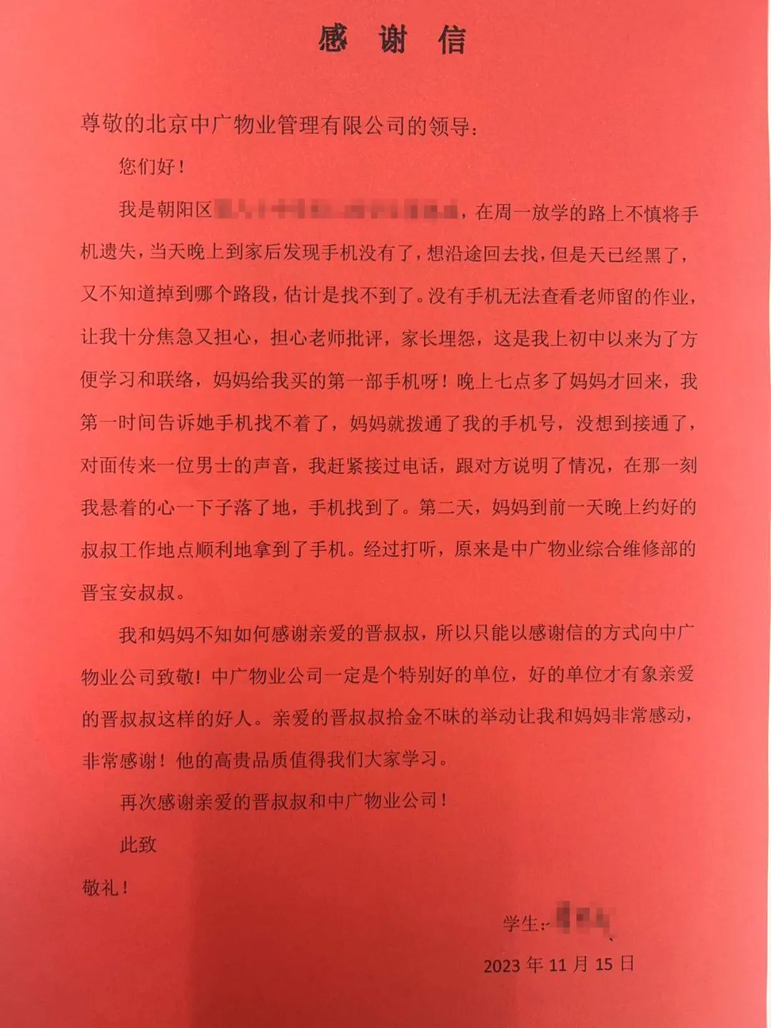 近日,北京中廣物業(yè)管理有限公司收到一封感謝信,表達(dá)對央視光華路項目部員工晉寶安拾金不昧歸還手機(jī)的感激之情。