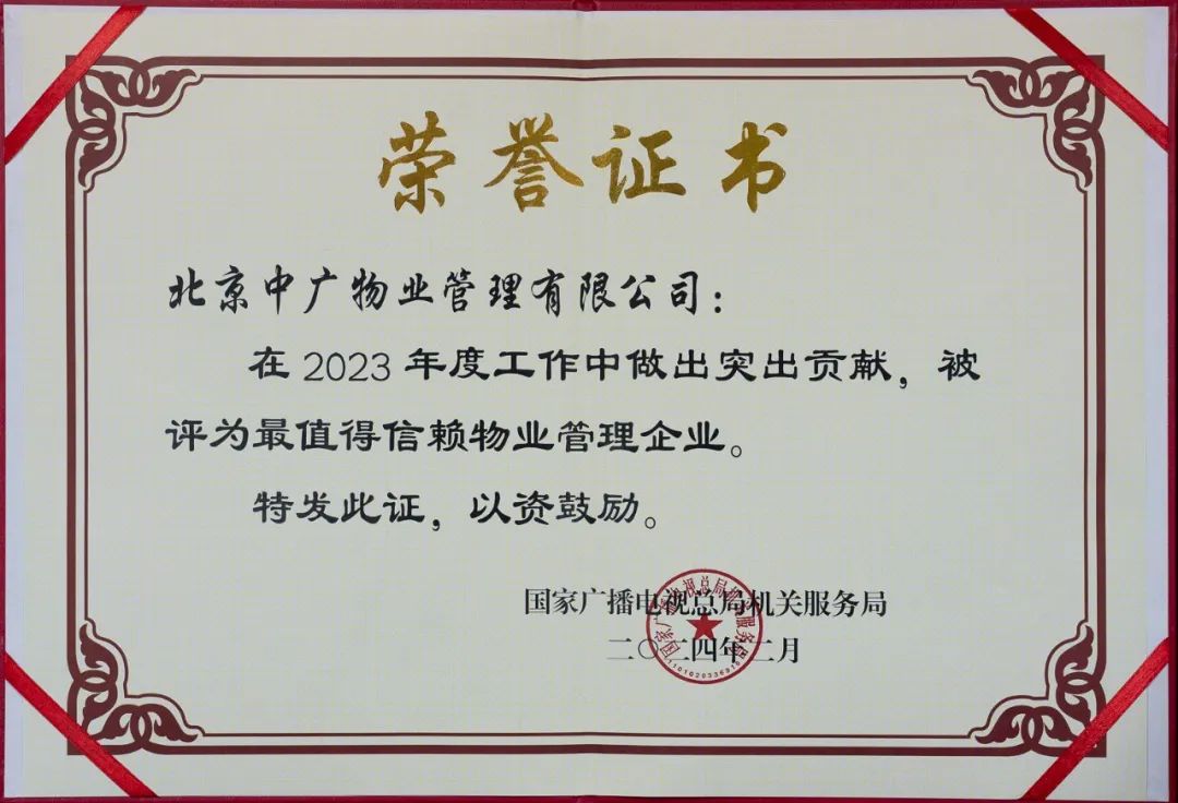 2月7日,國家廣播電視總局機關(guān)服務局召開2024年工作會議。北京中廣物業(yè)管理有限公司連續(xù)第十四年榮獲“最值得信賴物業(yè)管理企業(yè)”稱號。