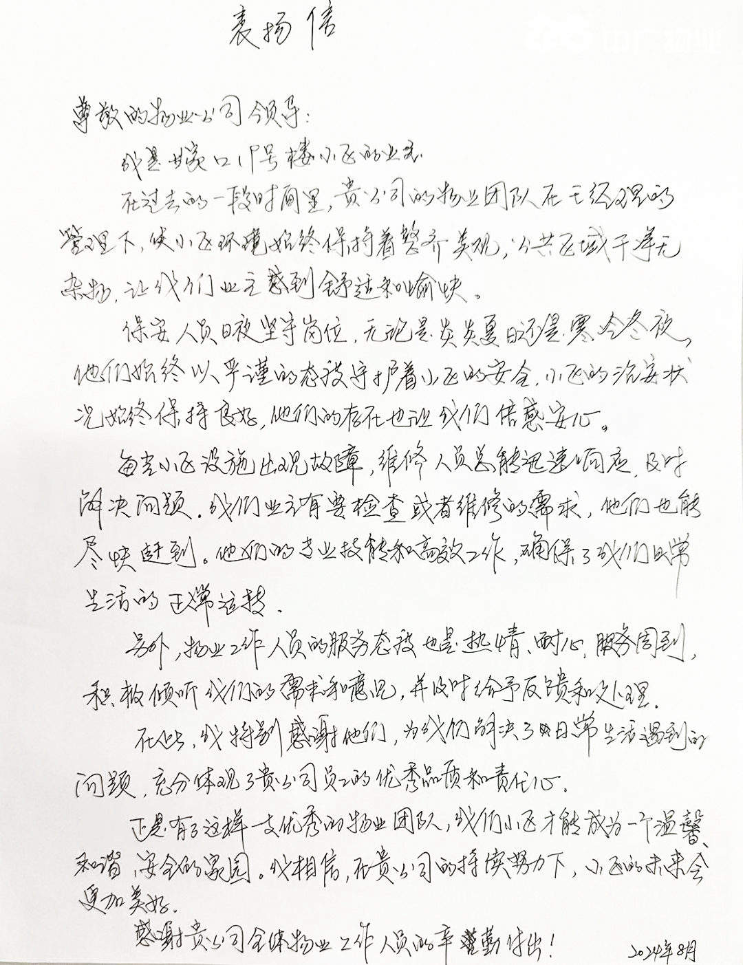 來(lái)信稱,在過(guò)去的一段時(shí)間里,公司物業(yè)團(tuán)隊(duì)服務(wù)工作細(xì)致周到,積極傾聽業(yè)主的需求和意見(jiàn),幫助解決日常生活中遇到的問(wèn)題,充分體現(xiàn)了中廣人熱情、耐心的服務(wù)態(tài)度和高度責(zé)任感。同時(shí),保安人員日夜堅(jiān)守崗位,小區(qū)的治安狀況始終保持良好,讓業(yè)主倍感安心;每當(dāng)業(yè)主家中報(bào)修,維修人員總能迅速響應(yīng),高效處置,憑借專業(yè)的技能,確保業(yè)主生活正常運(yùn)轉(zhuǎn);保潔人員辛勤付出,使小區(qū)環(huán)境始終保持著整齊美觀,公共區(qū)域干凈無(wú)雜物,讓業(yè)主感到舒適和愉快。感謝公司物業(yè)團(tuán)隊(duì)的辛勤付出,小區(qū)的未來(lái)會(huì)更加美好。