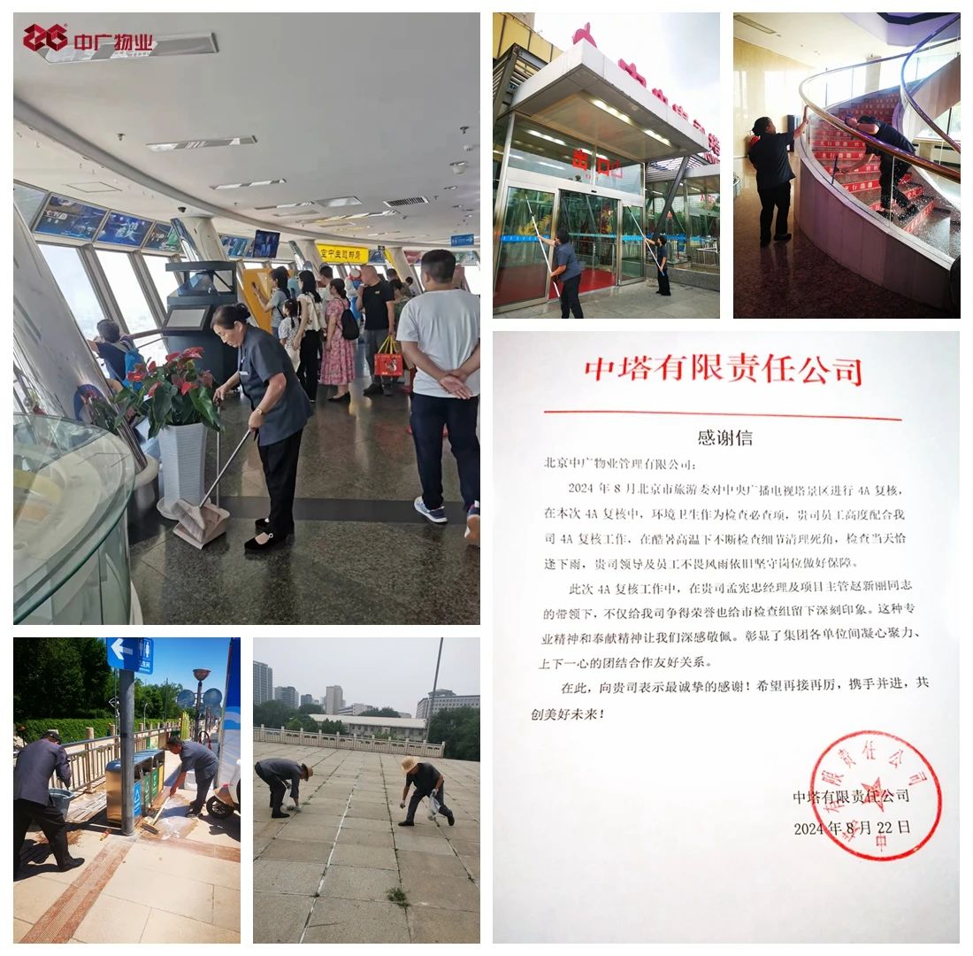 來(lái)信稱,項(xiàng)目員工在酷暑高溫下不斷檢查細(xì)節(jié)清理死角,展現(xiàn)出專業(yè)精神和奉獻(xiàn)精神,彰顯了中視實(shí)業(yè)集團(tuán)各下屬公司間凝心聚力、上下一心的團(tuán)結(jié)合作友好關(guān)系。本次中塔景區(qū)4A復(fù)核工作,環(huán)境衛(wèi)生是檢查的必查項(xiàng)。由于復(fù)審期間正值暑期客流量高峰期,作為開放式且無(wú)指定就餐區(qū)的旅游景點(diǎn),客流量與垃圾產(chǎn)生量成正比增加,對(duì)外圍環(huán)境的清潔保障帶來(lái)極大的挑戰(zhàn),再加之是在高溫天氣下的室外作業(yè),更是給復(fù)審評(píng)定工作帶來(lái)了雙重“烤”驗(yàn)。項(xiàng)目管理團(tuán)隊(duì)迎難而上,對(duì)責(zé)任區(qū)域進(jìn)行地毯式雜物清掃,并確保垃圾桶外觀干凈整潔。塔內(nèi)區(qū)域加強(qiáng)公區(qū)及衛(wèi)生間巡視頻次及清潔力度,隨時(shí)保持鏡面、地面的干凈整潔。此外項(xiàng)目也嚴(yán)格按照要求,做好各類表單的規(guī)范填寫、整理及匯總工作。檢查當(dāng)天恰逢降雨,項(xiàng)目團(tuán)隊(duì)不畏風(fēng)雨,堅(jiān)守崗位做好服務(wù)保障。不僅為中塔景區(qū)爭(zhēng)得榮譽(yù),也給北京市旅游發(fā)展委員會(huì)檢查組留下深刻印象。
