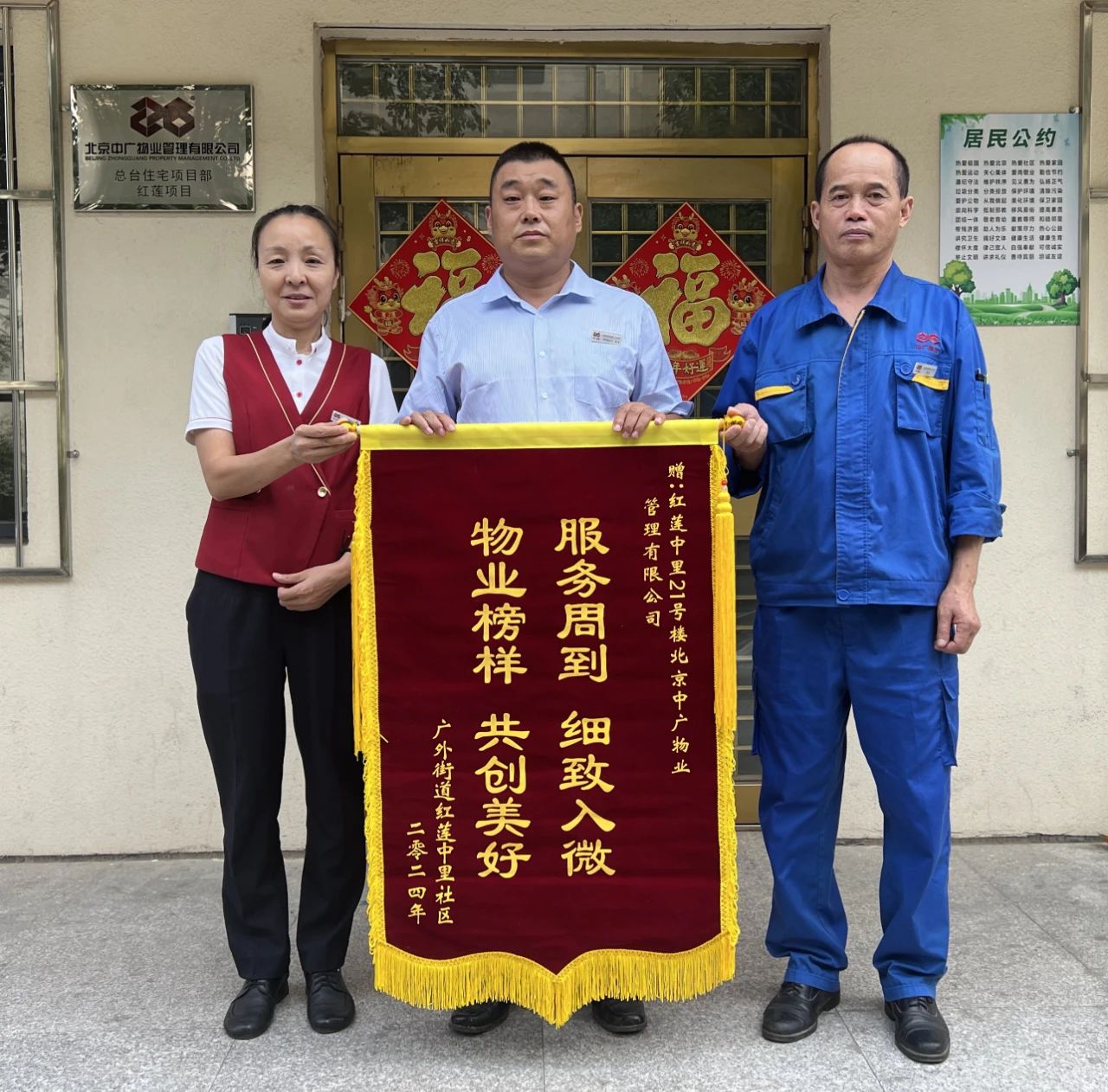 近日,廣外街道紅蓮中里社區(qū)向北京中廣物業(yè)管理有限公司紅蓮項(xiàng)目送上一面寫有“服務(wù)周到 細(xì)致入微 物業(yè)榜樣 共創(chuàng)美好”字樣的致謝錦旗,感謝公司對(duì)社區(qū)工作的大力支持。