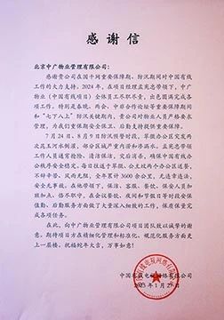 來(lái)信表示,中廣物業(yè)公司在國(guó)家廣電光纜干線網(wǎng)重要保障期,特別是春晚、兩會(huì)、中非合作論壇等重要保障期間和“七下八上”防汛關(guān)鍵期內(nèi),對(duì)物業(yè)人員嚴(yán)格要求管理,公司團(tuán)隊(duì)加班加點(diǎn)、恪盡職守,在會(huì)議、夜間和節(jié)假日等時(shí)段安保值勤、后勤服務(wù)方面做了大量深入細(xì)致的工作,保質(zhì)保量完成各項(xiàng)任務(wù),為中國(guó)有線重保期安全保衛(wèi)、后勤支持提供重要保障。同時(shí),公司保障團(tuán)隊(duì)每日往返于翠微、公主墳兩個(gè)辦公區(qū),不辭辛苦、風(fēng)雨無(wú)阻,全年累計(jì) 3600 余公里,無(wú)違章違法,安全無(wú)事故。在此,向中廣物業(yè)公司致以誠(chéng)摯的謝意。