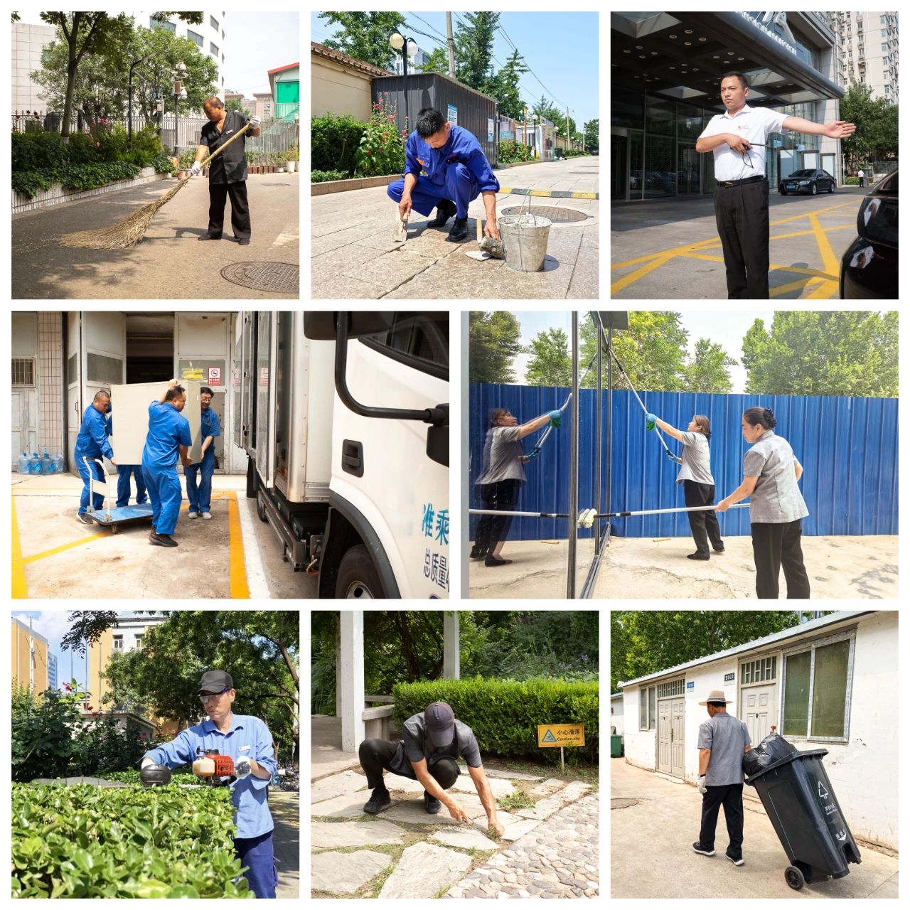 烈日下,在公司所服務(wù)的總局、總臺各址辦公區(qū)域及住宅小區(qū)內(nèi),中廣物業(yè)員工們忙碌身影隨處可見。即便烈日將皮膚曬得黝黑,站崗執(zhí)勤的秩序維護(hù)員依舊一絲不茍地核查進(jìn)出人員與車輛,不放過任何安全隱患。維修人員對外圍設(shè)施進(jìn)行修繕,他們的工作服早已被汗水浸透,依然憑借專業(yè)技能和敬業(yè)精神,確保轄區(qū)的設(shè)施設(shè)備正常運(yùn)行。保潔員在高溫下默默勞作,他們的臉頰被曬得通紅,卻從未停下腳步,清掃道路、垃圾分類、擦拭公共設(shè)施,用勤勞的雙手為業(yè)主創(chuàng)造干凈整潔的環(huán)境。高溫炙烤下,綠化員工手持澆灌設(shè)備穿梭在綠化帶間,為花草樹木送去“甘霖”,讓它們在烈日下依舊生機(jī)勃勃,為園區(qū)增添一抹清涼綠意。車隊(duì)員工揮汗如雨,高效完成一次次裝載、搬運(yùn)任務(wù),確保物資完好無損運(yùn)送至業(yè)主指定地點(diǎn)。